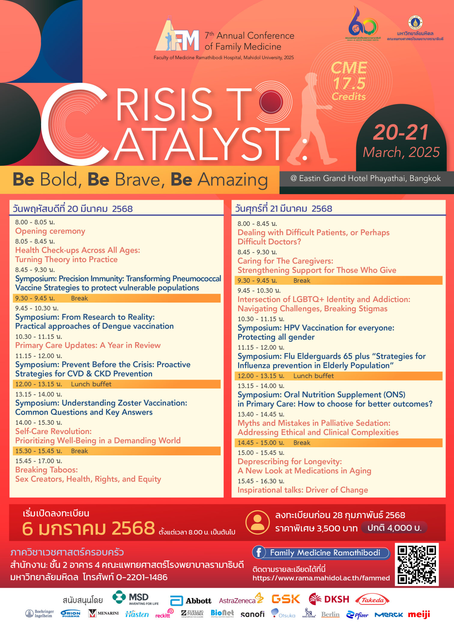 ภาควิชาเวชศาสตร์ครอบครัว คณะแพทยศาสตร์โรงพยาบาลรามาธิบดี มหาวิทยาลัยมหิดล กำหนดจัดประชุมวิชาการ 7th Annual Conference of Family Medicine 2025 "Crisis to Catalyst: Be Bold, Be Brave, Be Amazing" วันที่ 20-21 มีนาคม 2568 ณ โรงแรมอีสติน แกรนด์ พญาไท